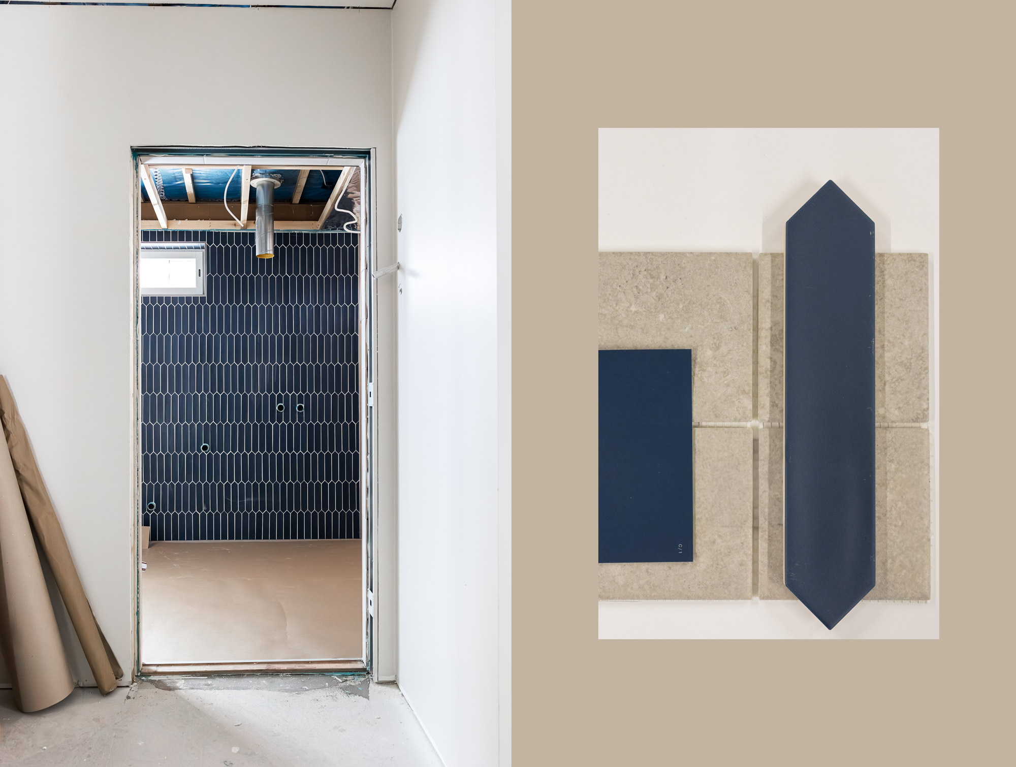 Kylpytiloihin haluttiin tummansinistä tunnelmaa. Seinään valikoitui muotoilultaan persoonalliset Cellon Lanse-laatat. Sinisen pariksi valittiin vaaleanharmaata Cellon Veinstone-lattialaattaa sekä valkoista seinälaattaa.