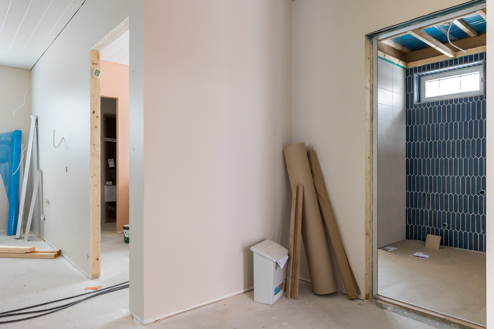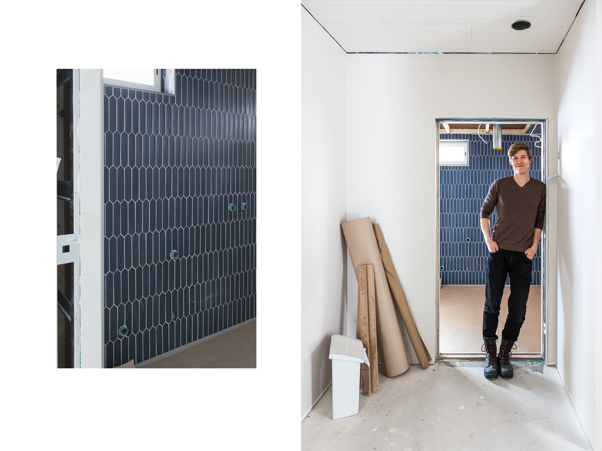“Tää on tosi kivaa, kun pääsee näkemään tehdyt valinnat vihdoin konkreettisesti. Nyt kun näkee kaikki värit ja laatat, niin täällä tuntuu jo kodilta. Silloin aluksi kun ei ollut väliseiniä, niin talo tuntui vielä tosi pieneltä”, Viivi kertoo.