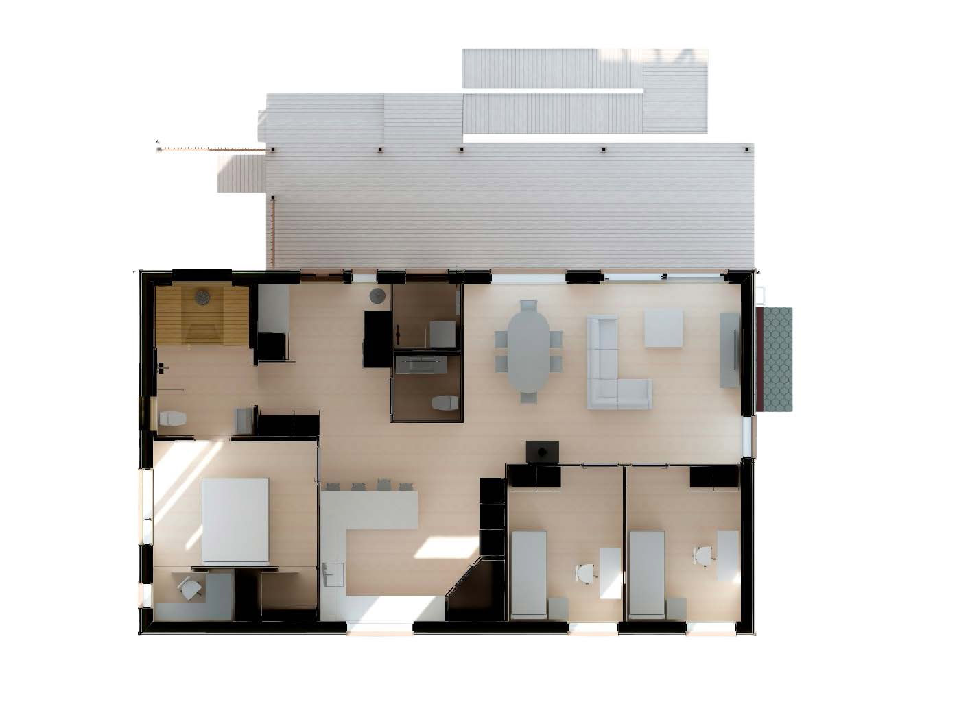 Kodin tilavasta eteisestä on käynti kylpytiloihin ja erilliseen wc:hen. Edessä aukeaa keittiö ja päämakuuhuone.