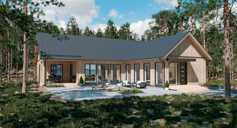 Tässä kulmamallin ladossa on selkeä ja arjessa toimiva pohjaratkaisu. Eteisestä oleskelutiloihin johtavan valoisan käytävän toinen seinä on ikkunaa. Sen varrella on lasten makuuhuoneet. Kodin keskellä on iso olohuone-keittiötila. Olohuoneen yhteydessä olevan katetun terassin voi muuttaa lisähuoneeksi. Vanhempien makuuhuone on omassa rauhassaan talon toisessa päässä.
