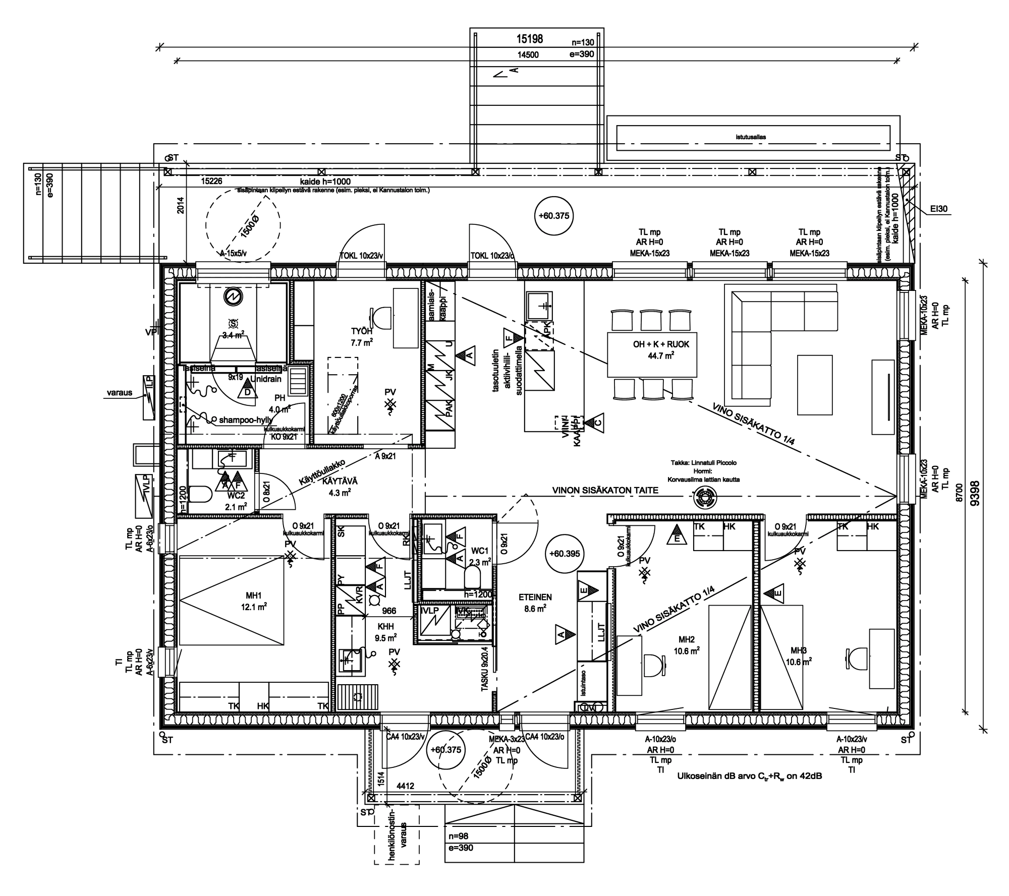 Lämmitys: Vesikiertoinen lattialämmitys, ilma-vesilämpöpumppu.